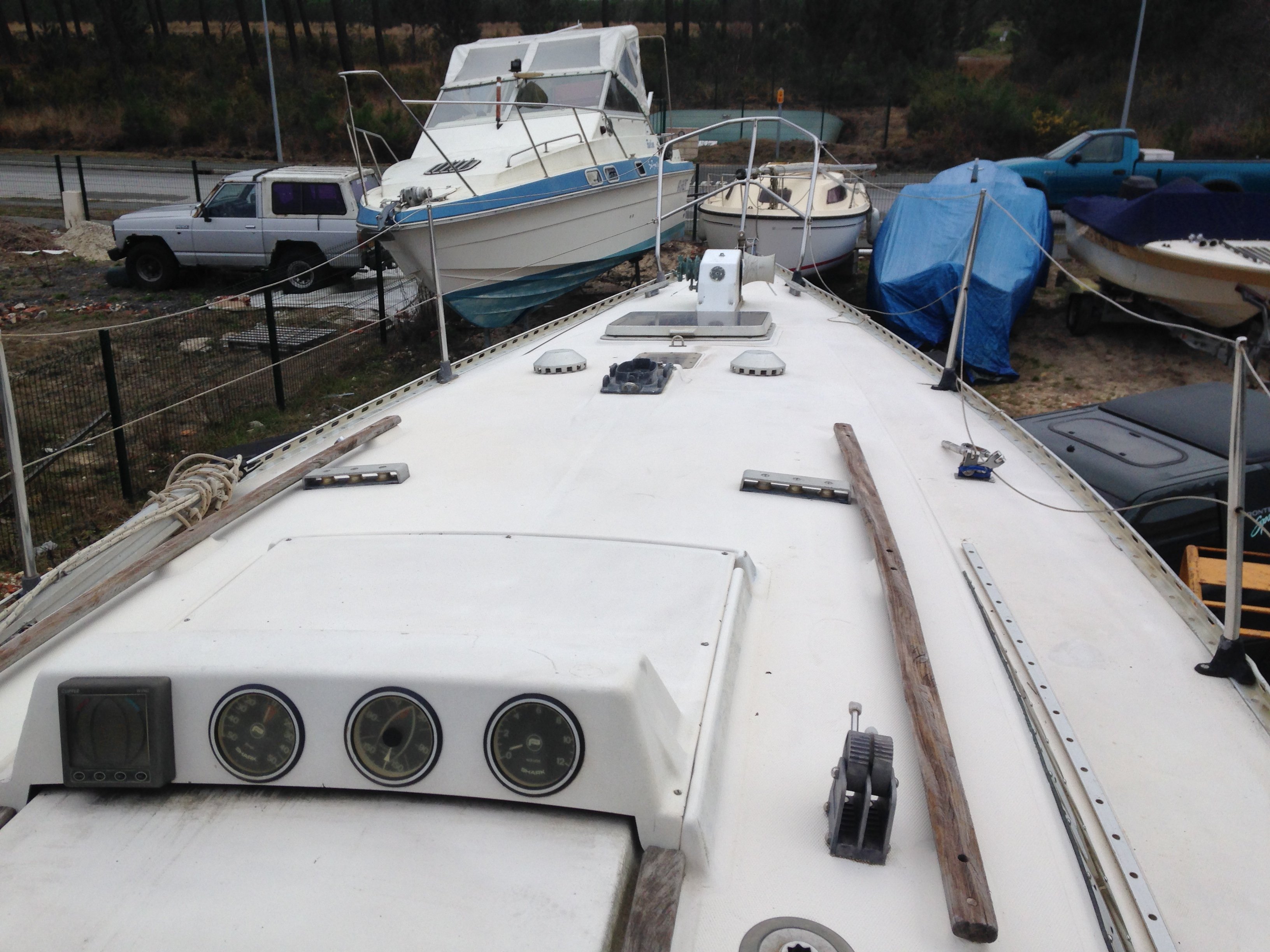 -La photo du roof en revanche confirme l'état assez minable des vaigrages, et la vetusté de la VHF... ainsi que tous les instruments de nav (hormis peut être l'anémomètre Nasa marine Clipper visible sur le capot de descente... mais dont la girouette capteur de tête de mât est cassée)... mais vu le prix du bateau, ça me semble être un moindre problème!