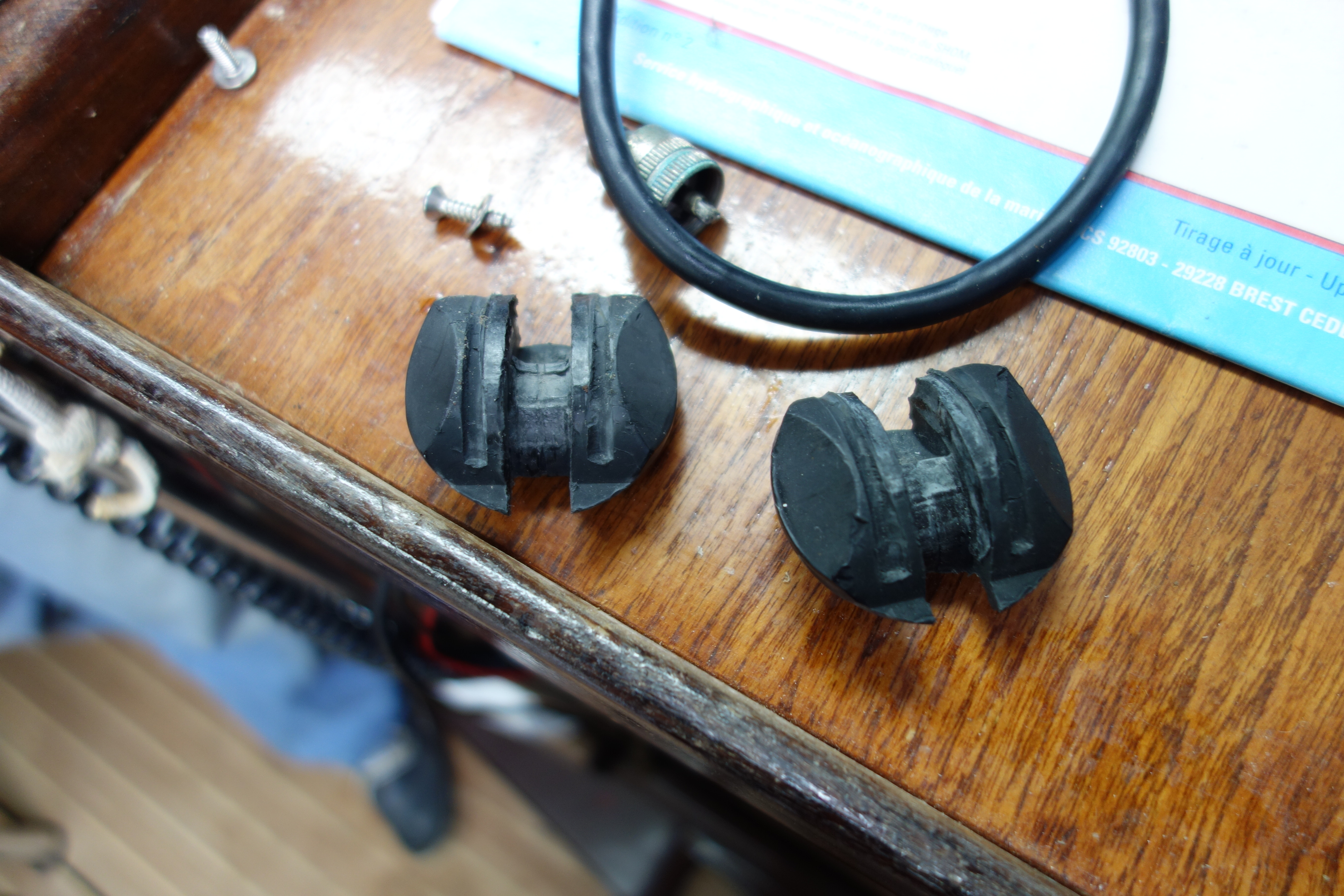 Deux inquiétudes : 1) les 2 demies-coques plastique du vis de Muletsemblent sérieusement usées... 2)réas bout de bôme cassés... -Accastillages/ bloqueurs, poulies, taquets... d'origines. Un peu usées. Lattes en teck de pont à remplacer intégralement... complètement pourries.