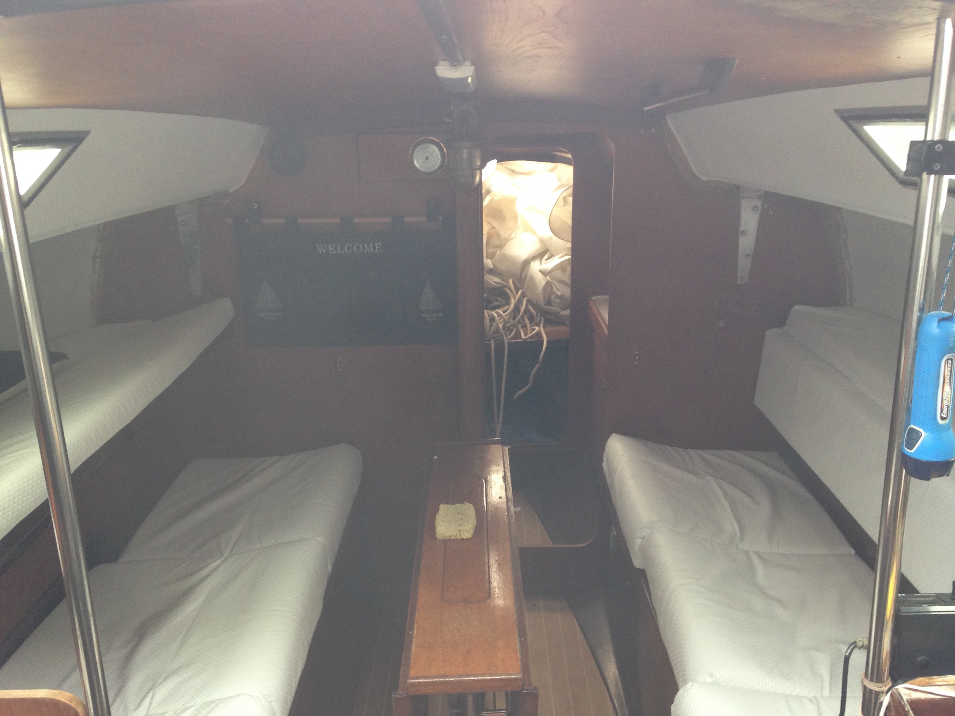 -La photo du roof en revanche confirme l'état assez minable des vaigrages, et la vetusté de la VHF... ainsi que tous les instruments de nav (hormis peut être l'anémomètre Nasa marine Clipper visible sur le capot de descente... mais dont la girouette capteur de tête de mât est cassée)... mais vu le prix du bateau, ça me semble être un moindre problème!