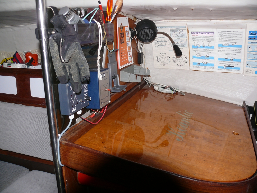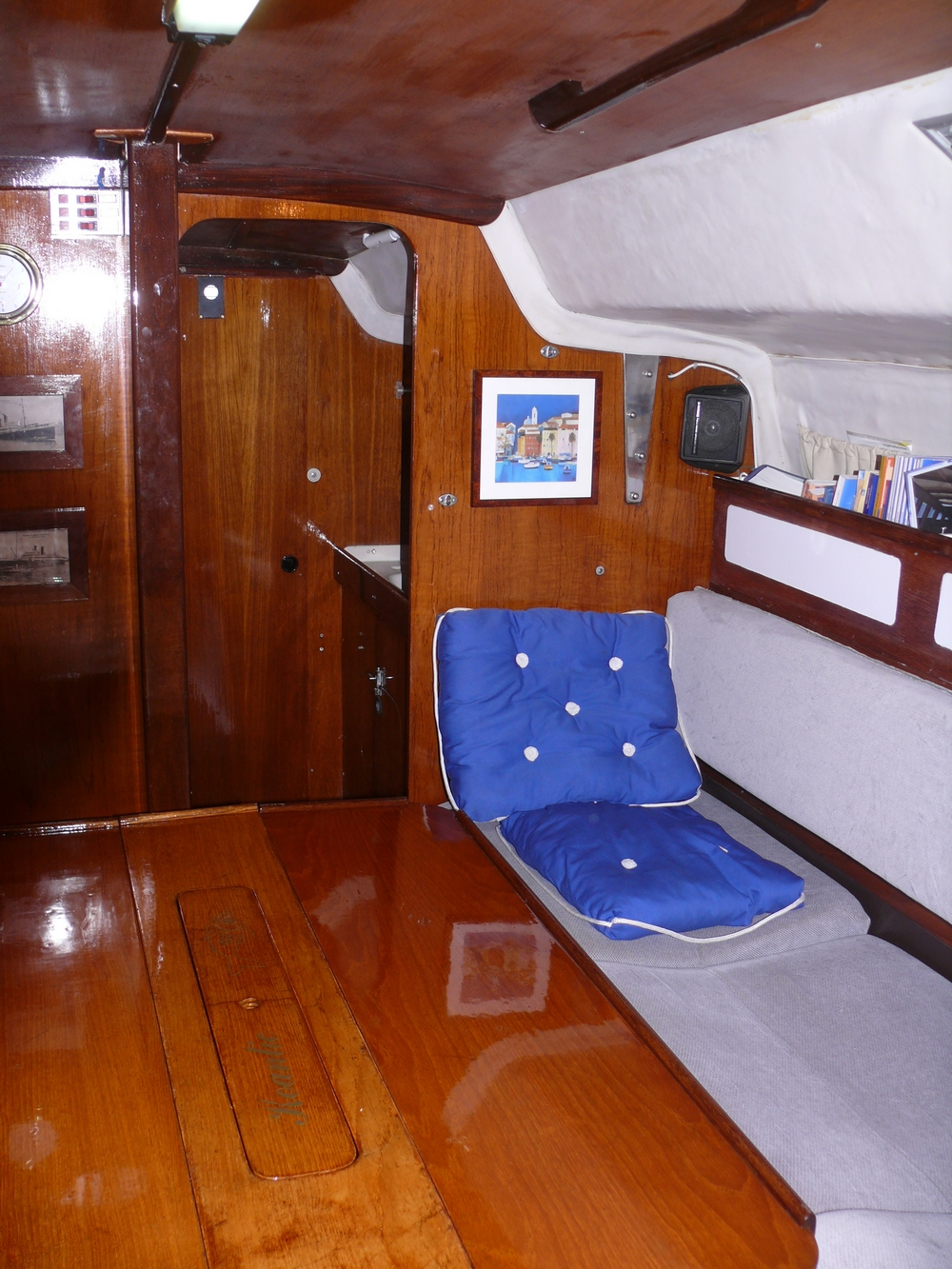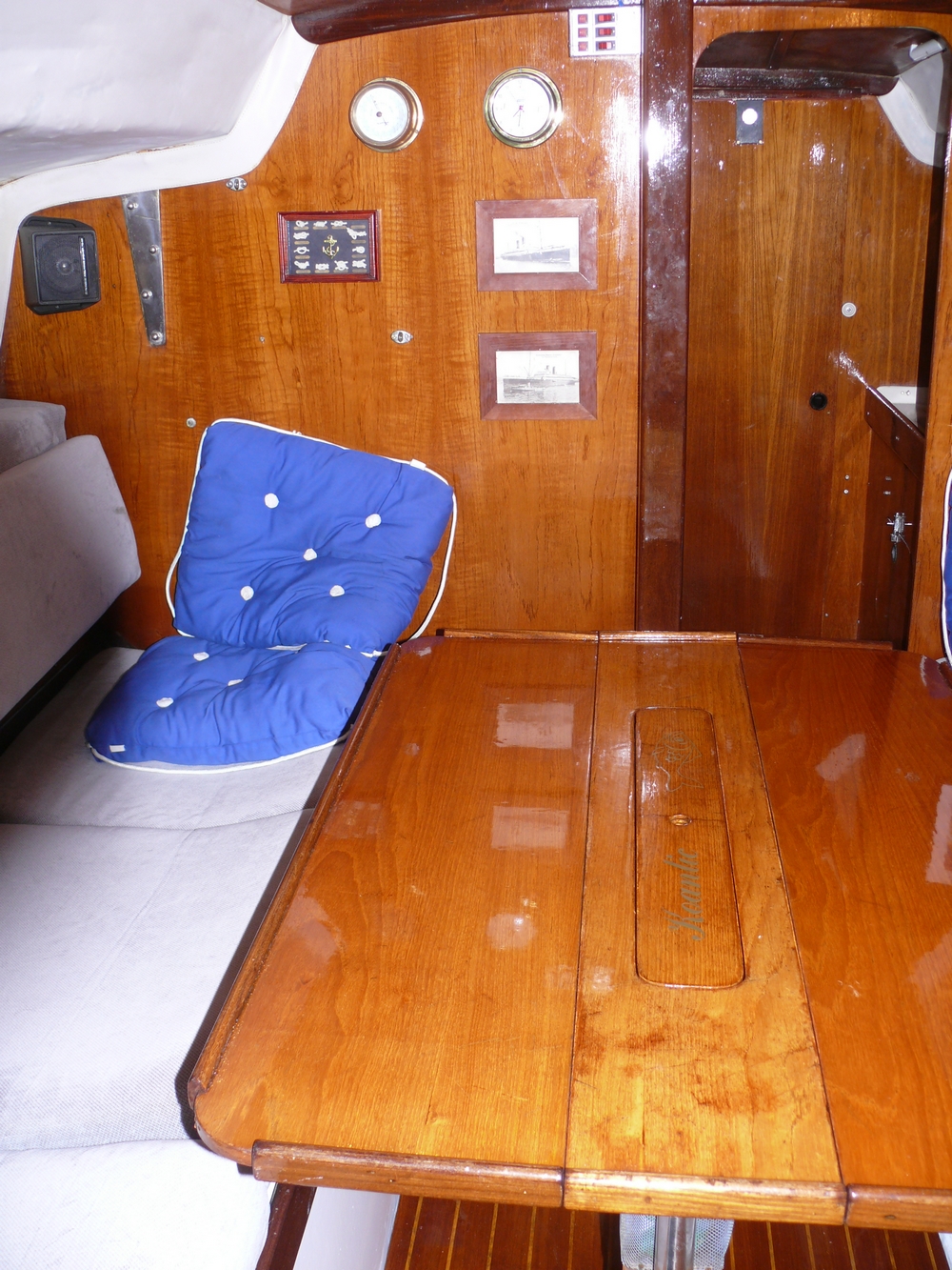 dans la cure de jouvence de grosse bise, j'ai déposé l'ensemble des aménagements du carré. poncage selon les règles de l'art et 3 couches de goldspar satin (International). la touche "satinée" donne un résultat très sympa!