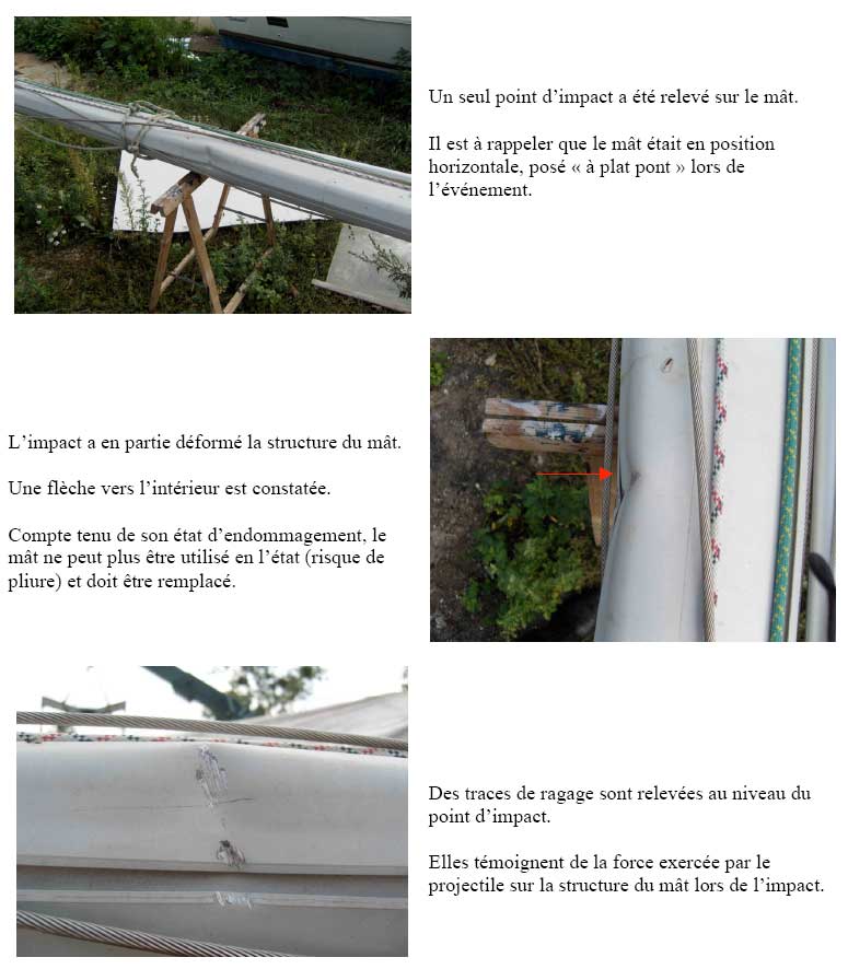 - Mat complet ( barre de flèche, semelle, sans courant, sans messager, sans antenne, sans feu de tête de mat, sans ferrure d'étai largable et avec un "pet" à 2m de la base au niveau du rail de coulisseau. Ce coup a été porté par vandalisme alors que le mat était posé sur le bateau, en remontant la Seine par un pavé jeté du pont de Bougival. Du fait de ce coup le mat n'est plus utilisable pour naviguer. Support d'éolienne ? d'antenne ?... longueur 10,5 m