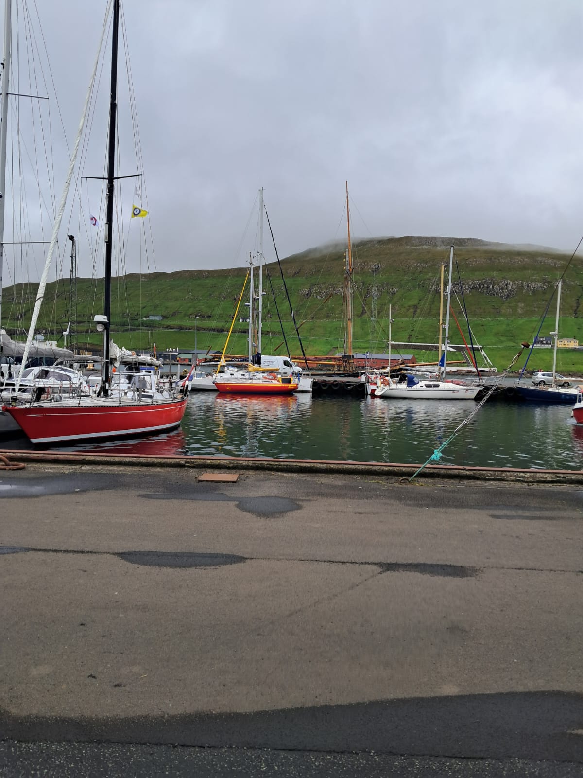 "arrivé hier soir à Torshavn. Ici il y a des bistrots sur le quai. La marina est plutôt grande. On doit tout payer par téléphone et carte bancaire. J’ai pas vu d’employés du port, je n'ai pas non-plus encore trouvé la capitainerie. Je vais rester ici jusqu'à dimanche au moins. Il y a du vent demain."