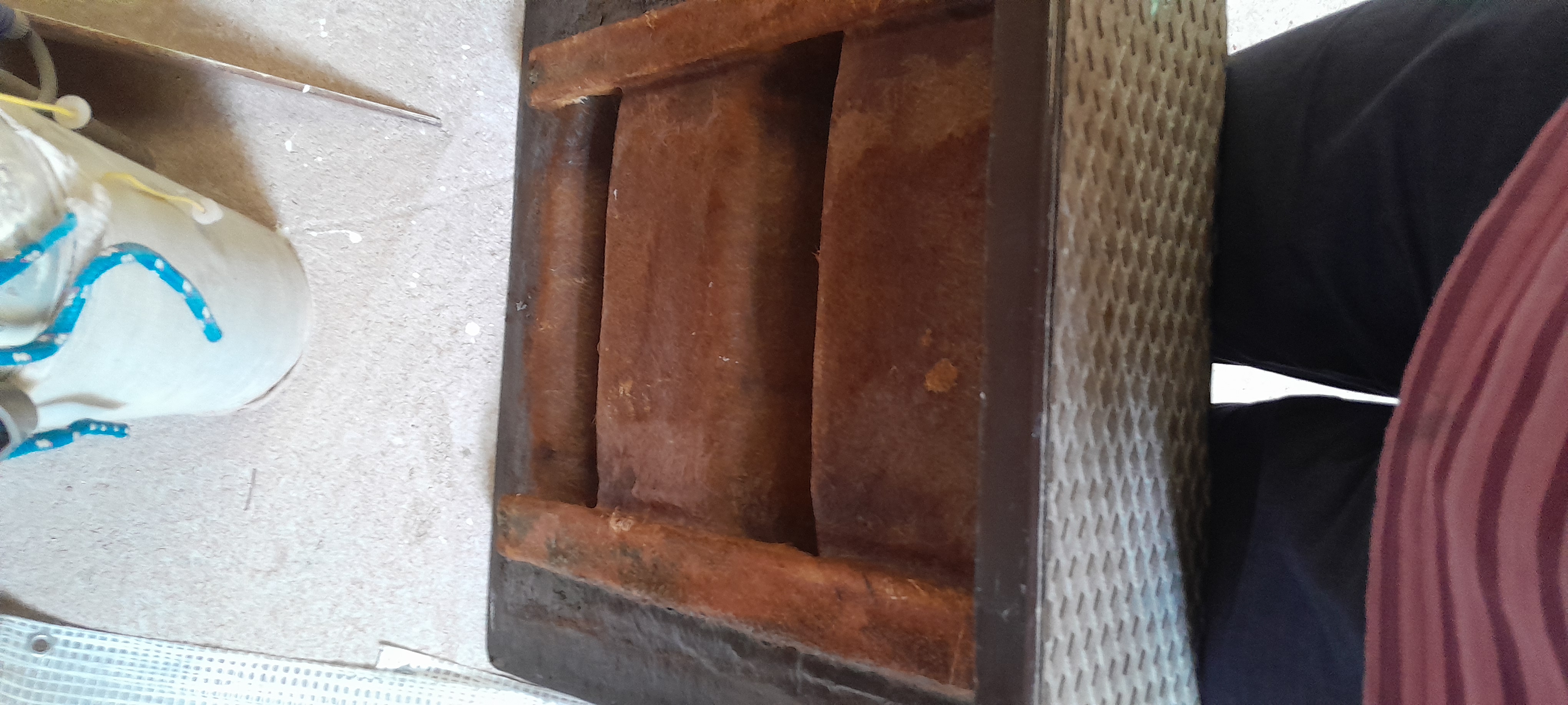 Vend ou donner une descente de carré en stratifié avec deux marches, de couleur marron, en état d'usage, pas d'éclats ou de fissures, sans sa mousse insonorisante.